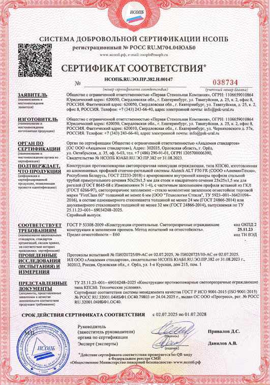 Подтверждает, что противопожарные конструкции, созданные нами с использованием профильных систем Alutech, полностью соответствуют самым строгим требованиям пожарной безопасности